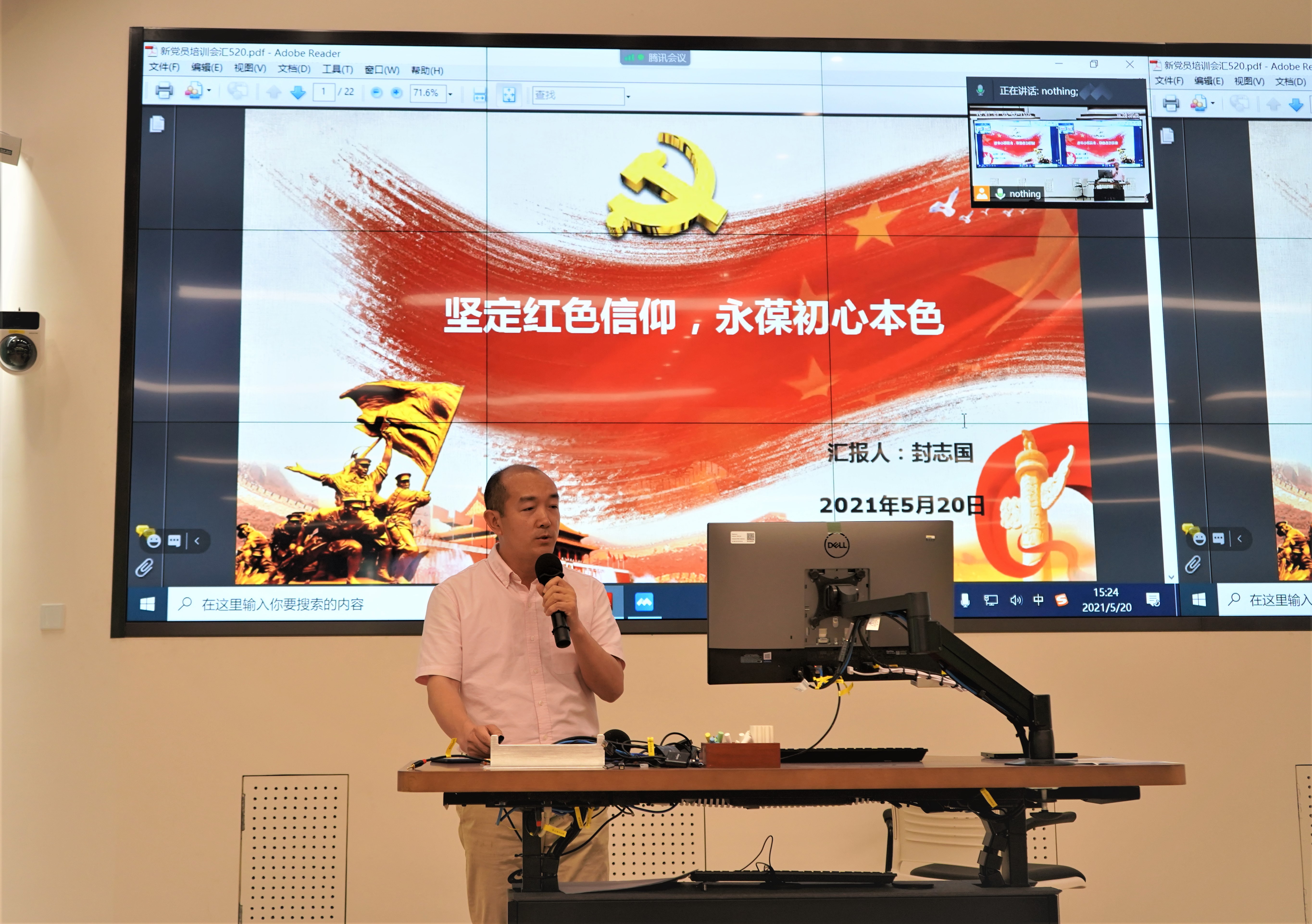 环境学院张大奕和审计室封志国作为新党员代表分享了自己加入党组织以来的感受和发挥作用情况。张大奕作为2020年在抗疫一线入党的党员,重点介绍了自己在驰援武汉抗疫期间充分发挥专业优势,积极深入高风险场所开展病毒排查、检测评估等工作情况,并表示自己在以后的工作中将继续攻坚克难,积极服务国家重大战略发展,用行动践行共产党人的初心和使命。封志国以“坚定红色信仰,永葆初心本色”为题,介绍了自己加入党组织以来在思想认识、服务群众、履职尽责等方面的成长与进步,并表示自己将在以后的工作中以更高标准要求自己,努力工作、积极奉献,用实际行动充分发挥党员先锋模范带头作用。