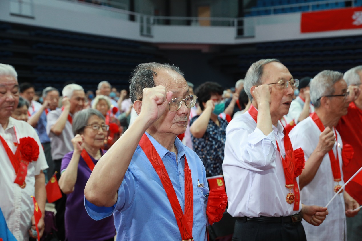 仪式现场,在校党委原书记方惠坚的领誓下,年逾古稀的老党员们在党旗的见证下重温入党誓词。誓言铿锵、不绝回响,入党一生一次、在党一生一世,光辉的纪念章代表着以习近平同志为核心的党中央的关怀和温暖,映照着老党员为共产主义事业奋斗终身的庄严承诺。