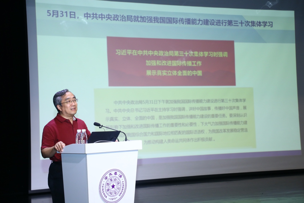 在首场讲座中,于运全首先分享了学习习近平总书记关于加强国际传播能力建设重要论述的体会,认为在当今百年之未有之大变局的背景下,中国要平视世界、开放沟通,构建融通中外的话语体系和叙事体系、逐步实现从“跟着讲”“对着讲”到“领着讲”。构建具有鲜明特色的战略传播体系,着力提高国际传播影响力、中华文化感召力、中国形象亲和力、中国话语说服力和国际舆论引导力,塑造好可信、可爱、可敬的中国形象。
