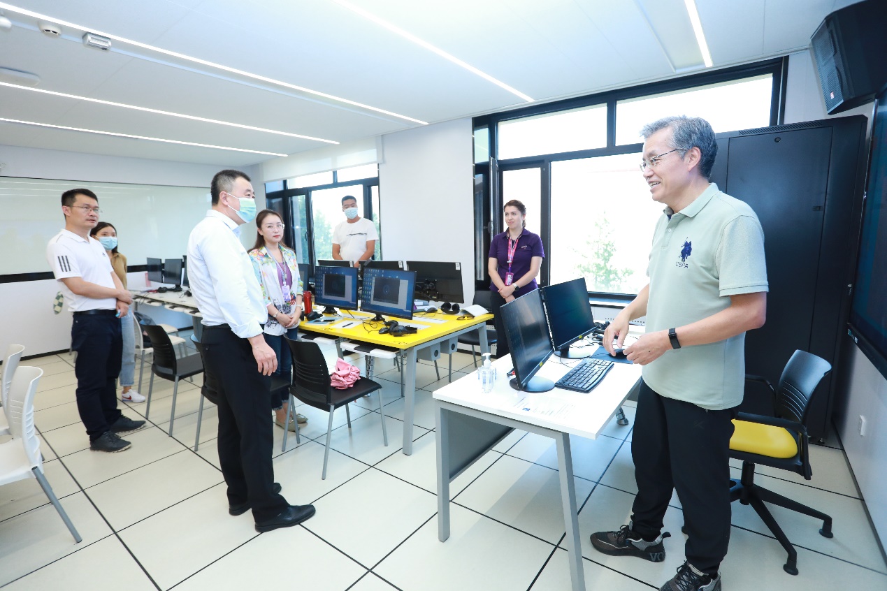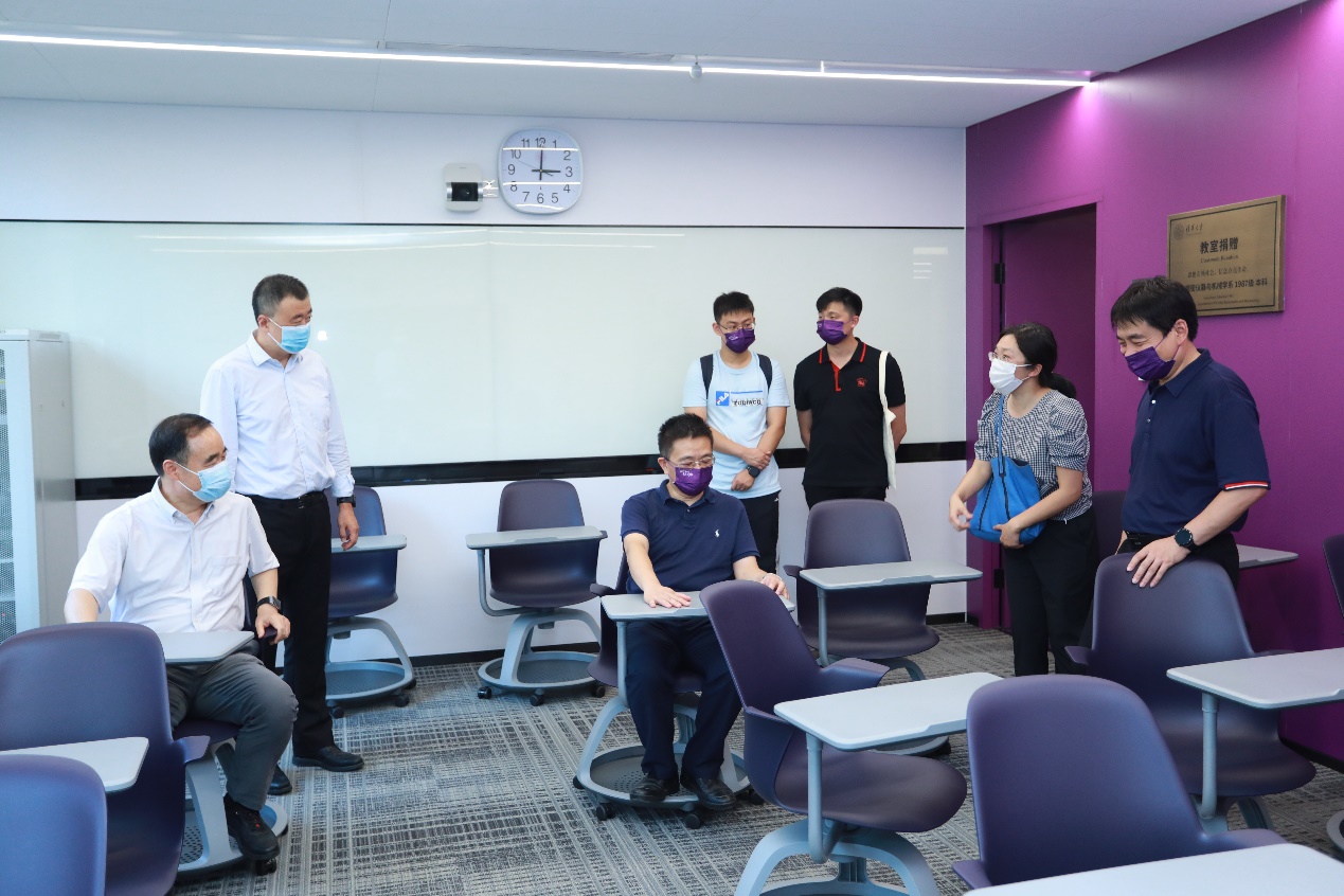 随后,吉俊民、杨斌、彭刚一行前往三教,检查启用前准备情况,仔细询问了三教家具配备、空气治理、文化建设、疫情防控及开学前准备等情况。经过一年多的翻新改建,三教将于9月13日正式启用,焕然一新的教学楼备受师生们期待。吉俊民、杨斌、彭刚走进多间教室,体验了新配置的拼接式桌椅,观看了语音、同传教室的布局设计,还现场试用新的多媒体屏幕进行课件展示和板书书写。