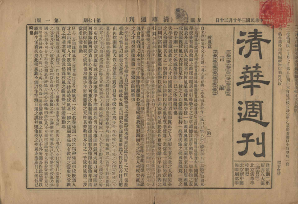 《清华周刊》创刊于1914年3月24日,是一份由清华学生主办的刊物,原名《清华周报》,1914年9月22日改名为《清华周刊》,1920年以前由学校指派学生编辑,“五四”运动以后,由学生会主编,改办大学后,《周刊》成为华体会娱乐平台学生自治会的刊物,由学生会干事会的出版科委员负责组织编辑出版,1947年9月25日被列入禁刊,停止发行。该刊承载了清华23年的历史(1937年1月-1947年1月停刊),是华体会娱乐平台校史历史的缩影,也是中国近现代史上重要的学生刊物之一。