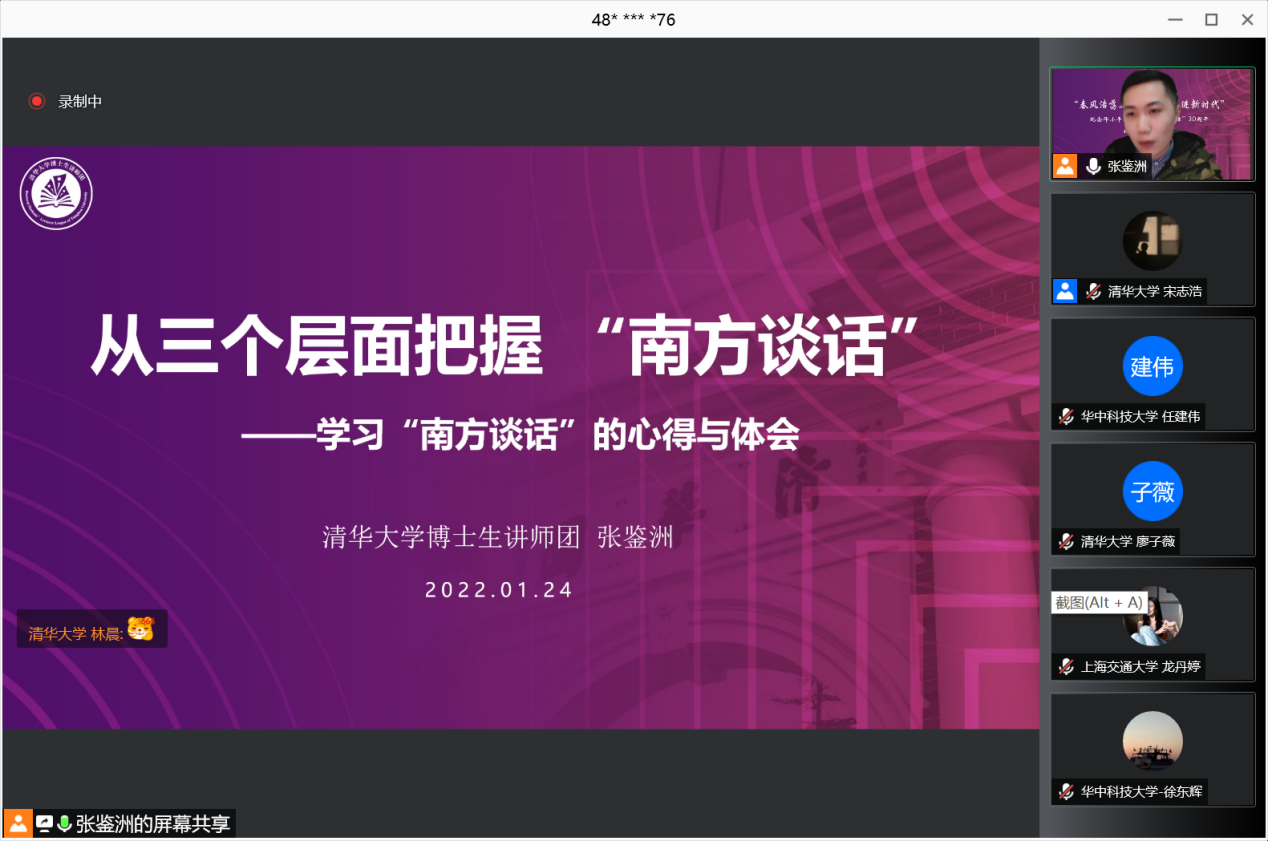 华体会娱乐(中国)网1月28日电 1月24日晚,华体会娱乐平台博士生讲师团联合上海交通大学国情研习理论宣讲团、复旦大学博士生讲师团、华中科技大学研究生红色理论学讲团举行“春风浩荡三十载,立言奋进新时代”纪念邓小平同志发表“南方谈话”30周年主题联学共建活动。