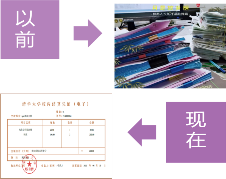 从厚厚一本票据到一个pdf文件,从一笔一画的手写票到一键生成的电子票,校内电子结算凭证的上线,让校内结算告别了“人工”时代,扫码缴费、系统开票,网上下载、无纸化报账,这样的流程通过信息技术帮助师生省去了多个“跑腿”环节,加强了内部控制,让校内结算效率大大提高。