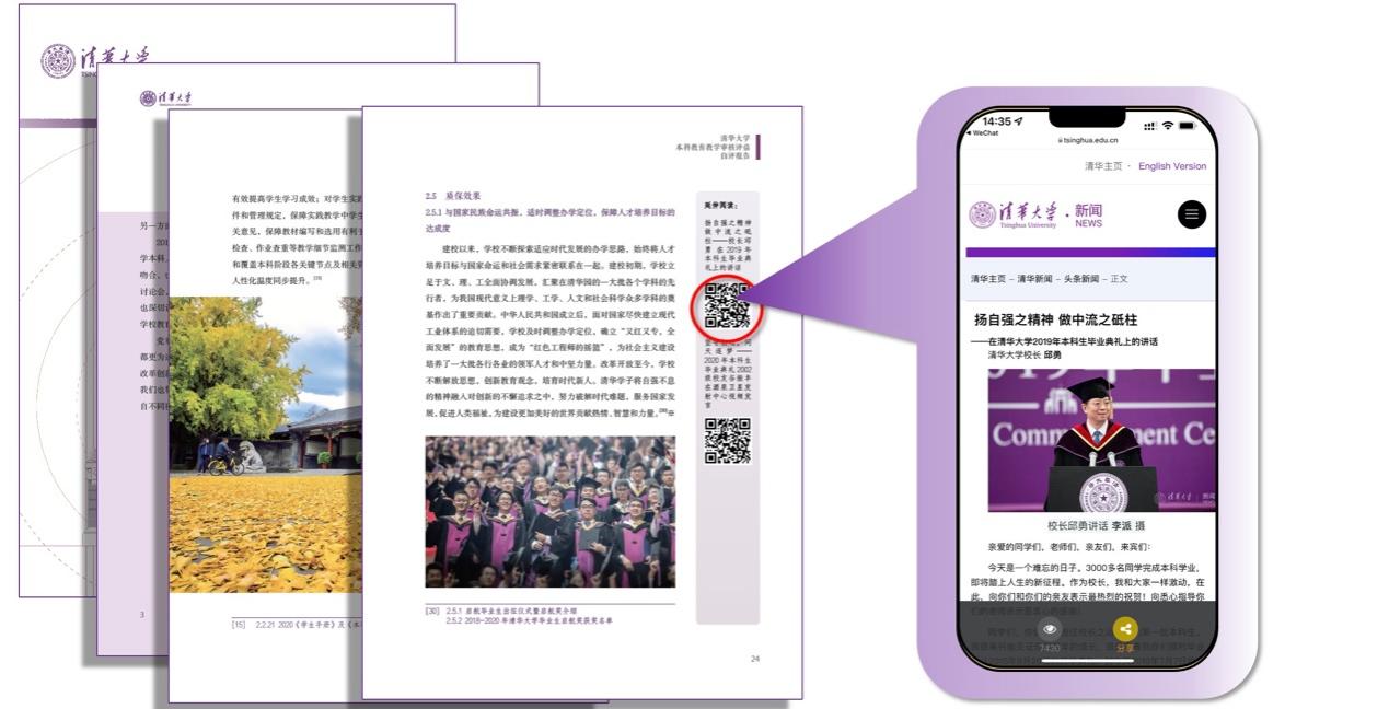 “篇幅上有字数限制,成文逻辑上有指标体系的严格规范,要想立体化、全方位地展现清华在本科教育教学中的成果,一定要有细节、有案例,所以我们就在正文旁加入二维码,用‘延伸阅读’的形式,链接学校各媒体平台近年来的教育教学典型案例和专题报道,希望能增加自评报告的丰富性和深度。”教务处副处长杨帆说。