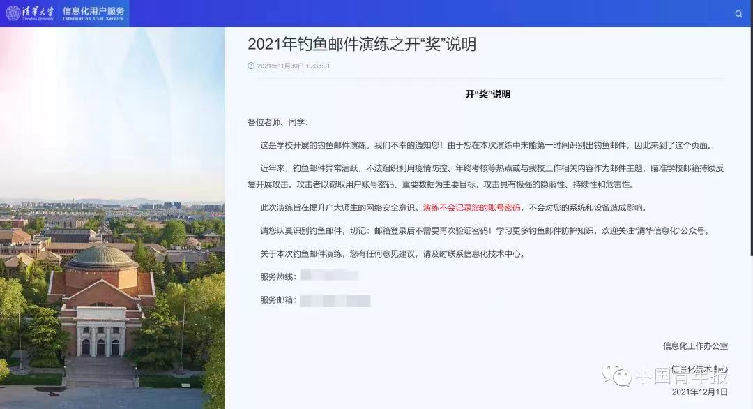 2021年12月,一封来自信息办的开“奖”说明在不少清华师生朋友圈刷屏,“中奖”的同学们在直呼学校“神操作”的同时,更在真实经历被“钓”之后对钓鱼邮件有了更强的警惕性和辨别力。