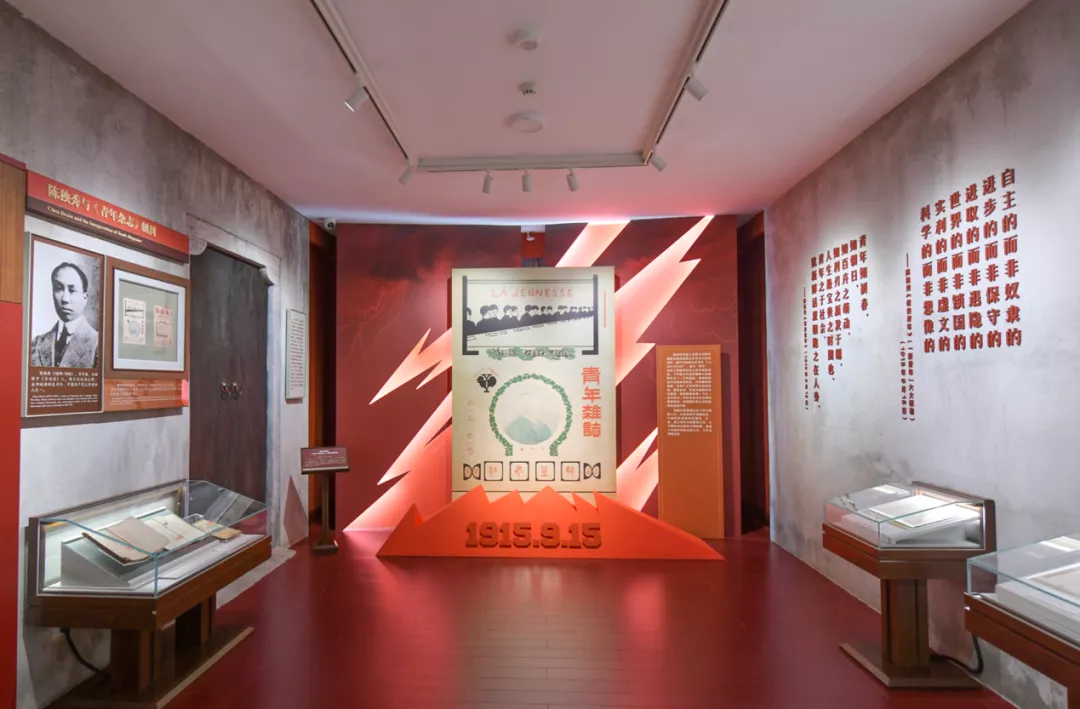 华体会娱乐平台美术学院展示艺术研究所所长洪麦恩主持设计北大红楼“光辉伟业红色序章”主题展,图为“新文化运动发端”展厅