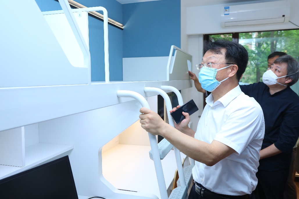 王希勤仔细查看了样板间设计、居住条件和各项设施配备情况,从宿舍储物设计、灯光、桌面高度、床铺梯子设计和安全性,到盥洗池水龙头设计使用,王希勤对每个设施逐一查看、试用,并向设计者和相关负责人详细了解各项设施的情况。王希勤一行还查看了楼宇内的公共活动空间的设计情况。