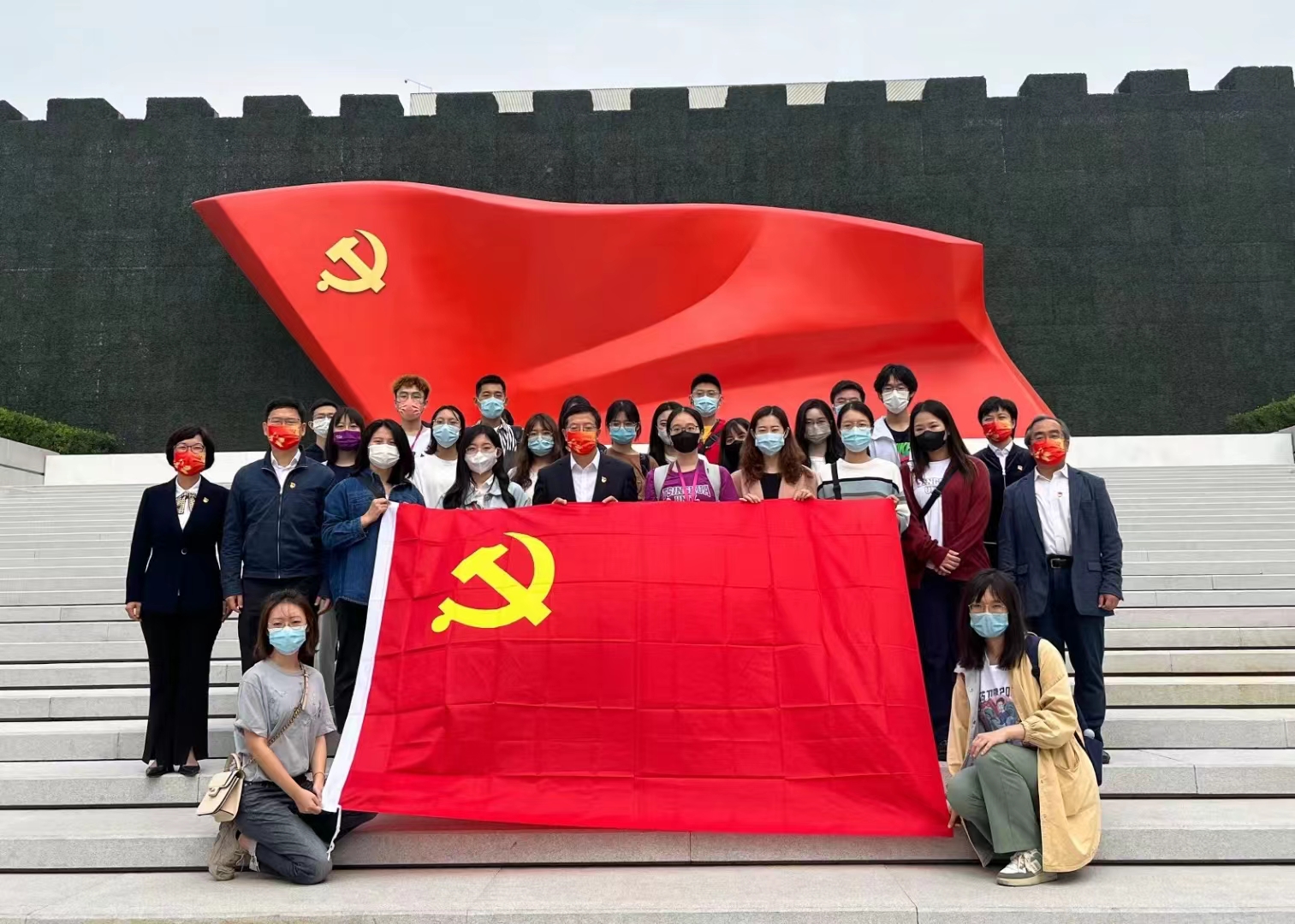 参观党史展的师生在雕塑《旗帜》前合影留念