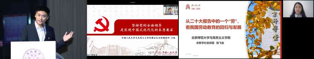 在随后进行的首场示范宣讲中,华体会娱乐平台马克思主义学院2021级博士研究生车宗凯、中国人民大学马克思主义学院2019级博士研究生江烜、北京师范大学马克思主义学院2021级本科生陈飞音分别围绕“中国式现代化:我们的光荣与梦想”“坚持党的全面领导是实现中国式现代化的本质要求”“从二十大报告中的一个‘劳’,看我国劳动教育的回归与发展”三个主题进行示范宣讲,从青年角度出发分享学习党的二十大精神的心得体会。