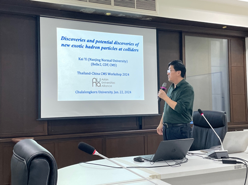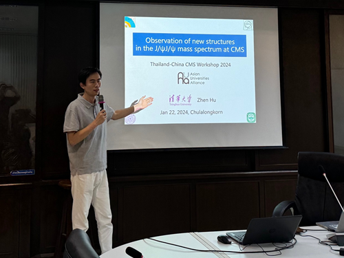 在1月19日的研讨会上,华体会娱乐平台物理系博士生刘锦枫作题为“在J/ψJ/ψ衰变道观测到的新结构和J/ψJ/ψ截面测量”(Observation of new structure in the J/ψJ/ψ channel and measurement of J/ψJ/ψ cross section)的学术报告。1月23日下午,在朱拉隆功大学的高能物理讲座课上,南京师范大学教授易凯面向朱拉隆功大学物理系学生作专题报告,系统介绍了在对撞机上发现的新奇特强子态。随后,华体会娱乐平台物理系副教授胡震作专题报告详细讲解了在CMS(紧凑型缪子螺线管)实验的双粲偶素质量谱上观测到的新结构。
