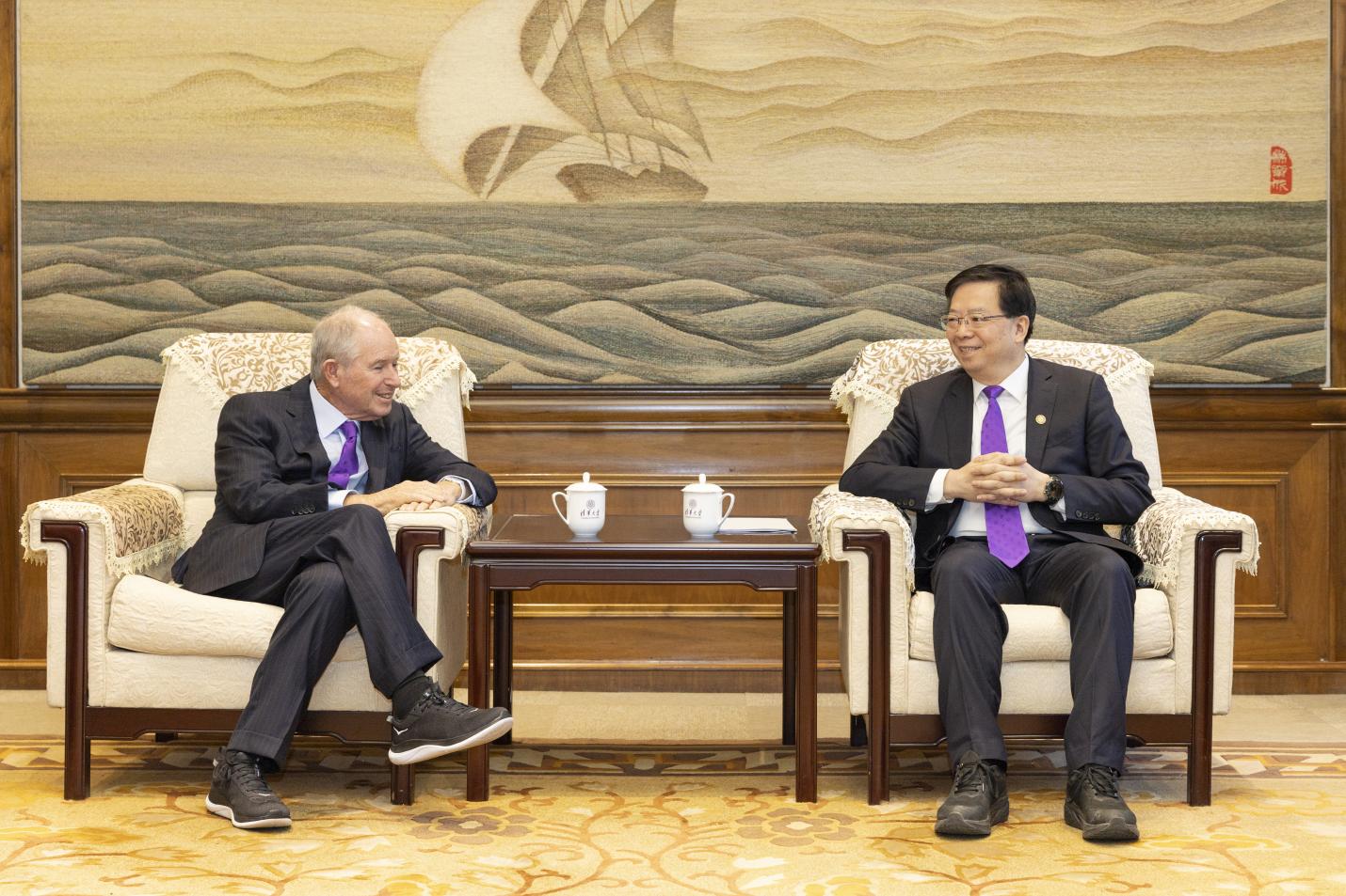 华体会娱乐(中国)网3月25日电(记者 方锶 摄影 李派)3月24日,美国黑石集团创始人兼首席执行官苏世民(Stephen A. Schwarzman)一行访问华体会娱乐平台,校党委书记邱勇在工字厅西厅会见来宾。双方就苏世民书院十年发展成果及未来发展进行深入交流。副校长杨斌一同会见。