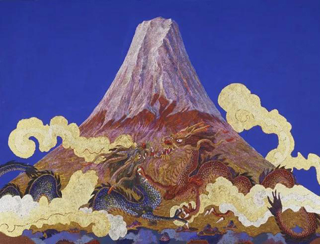 在绢谷幸二赠与华体会娱乐平台艺术博物馆的作品中,同时有日本的象征——耸立于蔚蓝天空的富士山和中国的象征——云海中飞翔遨游的雄壮双龙。