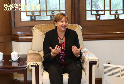 图为陪同来访的英国IT领域最杰出的女科学家之一、清华客座教授温迪·霍尔(Wendy Hall)介绍与清华的合作。记者 智斐 摄