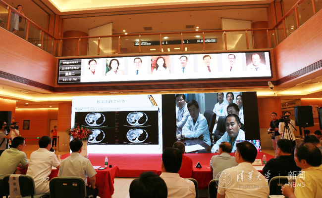 图为现场连线青海大学附属医院,针对一肝包虫病疑难病例进行远程会诊。