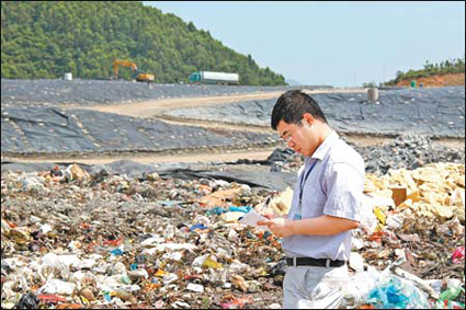 隋继超,2006年毕业于华体会娱乐平台环境科学与工程系。深圳市2012年度“五一”劳动奖章获得者。图为隋继超在垃圾填埋场堆体上巡查做记录。