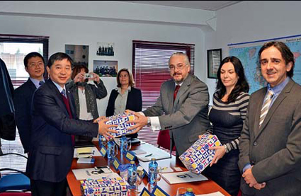 图为与西班牙圣得亚哥大学洽谈合作时与大学校长的合影。