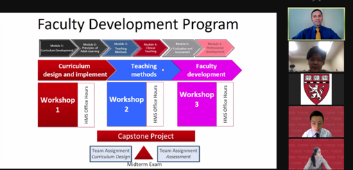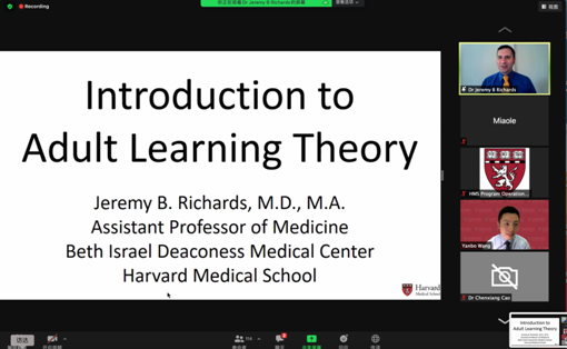 哈佛医学院师资培训项目课程负责人杰里米·理查兹(Jeremy Richards)介绍了2021年华体会娱乐平台临床医学院师资培训项目的整体计划、培训主题与内容、第一次工作坊的培训内容、授课师资、作业与考试要求、课程答疑等详细安排。