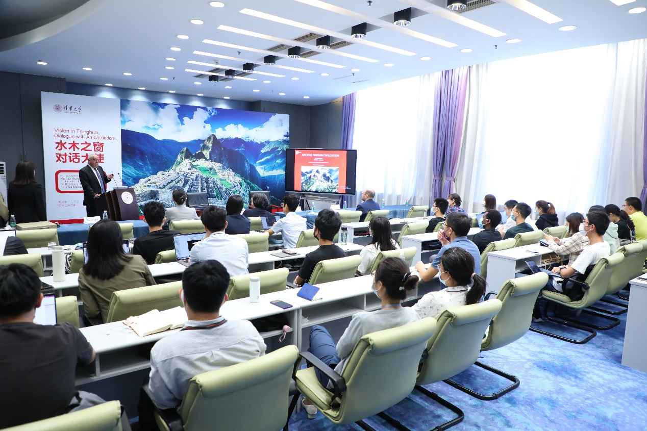 克萨达大使首先向清华学子介绍了秘鲁概况,同时回顾了秘鲁与中华文明的历史渊源,以及两国建交五十年来的友好合作历史。2013年,中秘建立全面战略伙伴关系以来,双方不断深化互信,拓展合作,连续多年保持秘鲁第一大贸易伙伴地位。今年是中国与秘鲁建交50周年、秘鲁独立200周年,他希望未来继续扩大两国合作,开展更加多元、更有成效的合作。