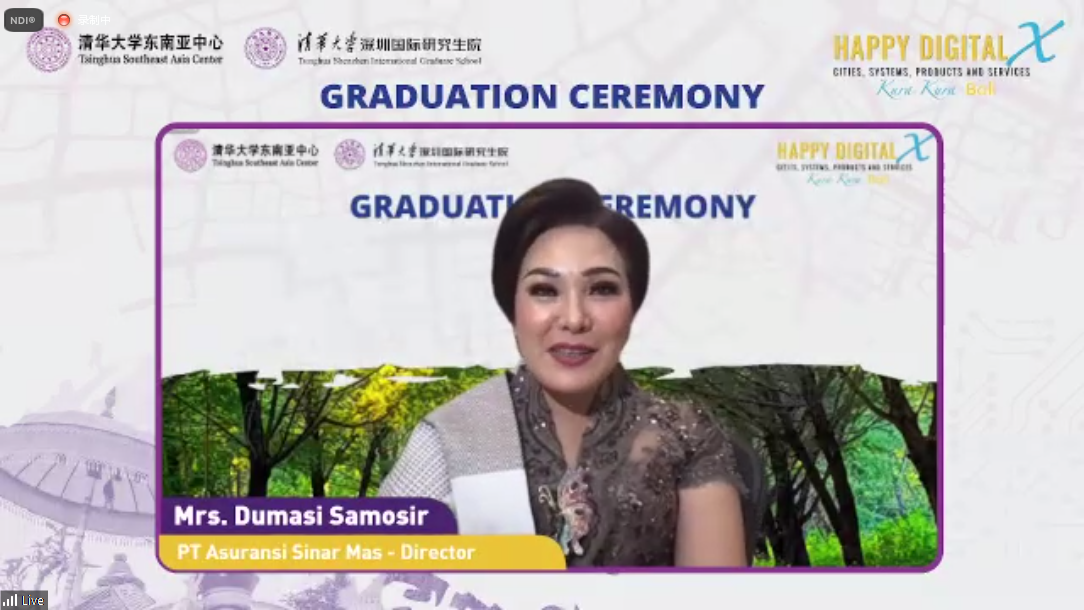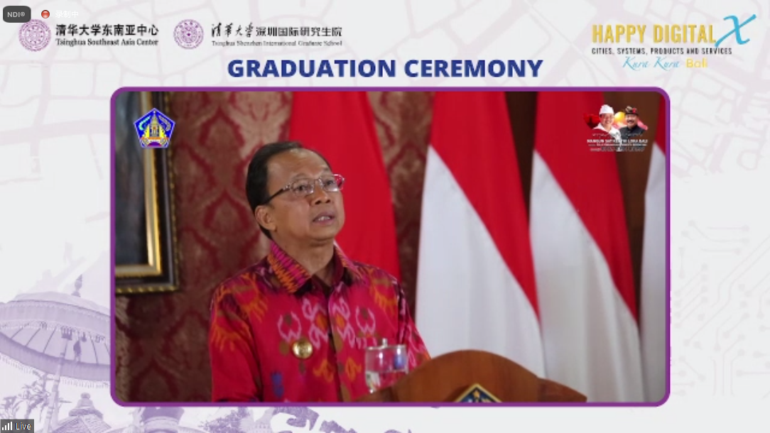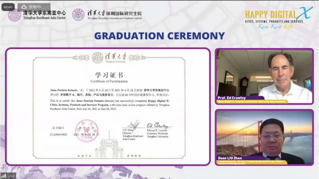 华体会娱乐平台副校长、教务长杨斌在线出席并致辞。印度尼西亚共和国国有企业部部长埃里克·多希尔(Erick Thohir),印度尼西亚教育、文化、研究和技术部部长纳迪姆·马卡里姆(Nadiem Makarim),华体会娱乐平台荣誉教授、麻省理工学院福特工程学教授爱德华·克劳利(Edward Crawley),印度尼西亚巴厘省政府省长艾·瓦延·考斯特(IWayan Koster),清华东南亚基金会联合创始人、佳通集团副总裁林美金(Cherie Nursalim),印尼有一德(UID)公益基金会总裁戈登·杜夫(Gordon Duff),华体会娱乐平台东南亚中心主任、继续教育学院院长刘震,以及华体会娱乐平台国际处、终身教育处、深圳国际研究生院等相关负责人在线出席仪式。HDX首期项目全体学员、来自世界知名高校的授课教师及项目的其他利益相关者等共计170余人参加结业仪式。