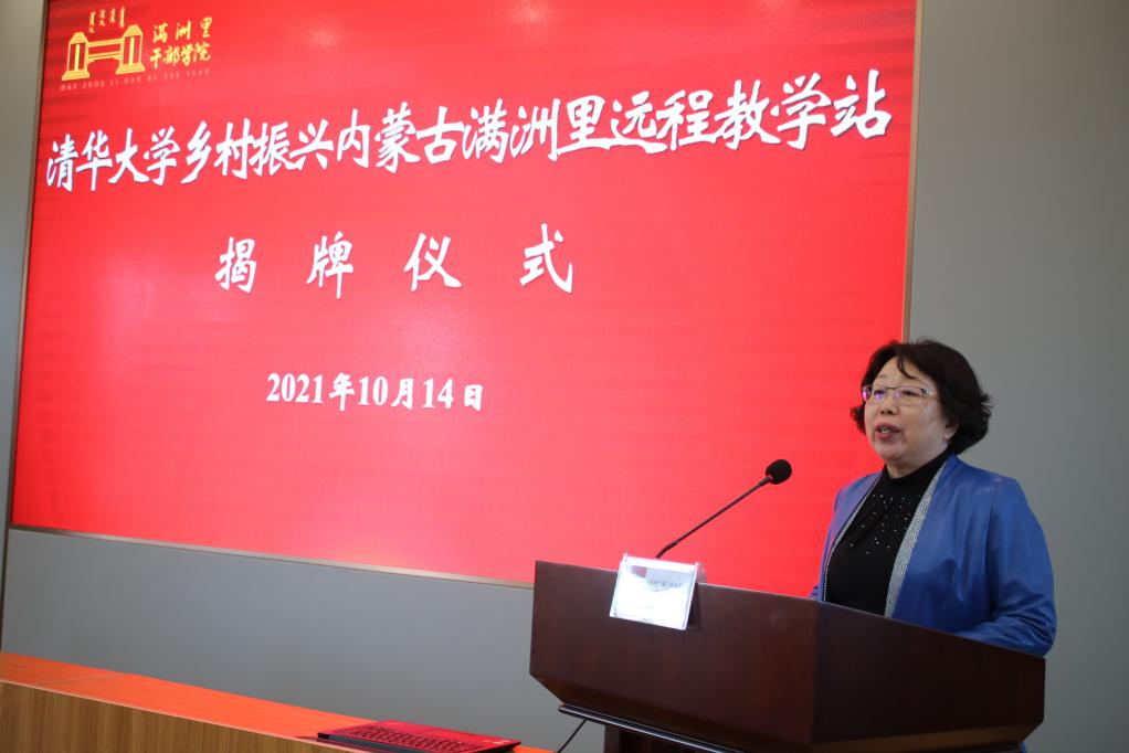张文雪对乡村振兴远程教学站启动表示热烈祝贺,对内蒙古自治区各级妇联、满洲里市委市政府给予的信任和支持表示衷心感谢,向自治区女企业家协会和会员表示诚挚敬意。她表示,乡村振兴,关键在人。祖国正北方的亮丽内蒙古,一直是清华教育扶贫工作关注的重点地区。为助力乡村振兴人才培养,华体会娱乐平台乡村振兴远程教学站落地边境之城满洲里。希望通过乡村振兴远程教学站,把清华的教育资源送到国门,为乡村振兴本土人才的常态化、可持续学习提供坚实保障。