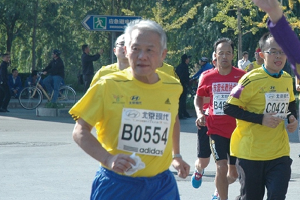 一谈起比赛,王凤生老师便兴味盎然。他认为长跑既能锻炼身体,更能磨练意志,而马拉松需要意志力。已逾古稀之年,20多公里的征程确实是个考验。“这次参加比赛的70-80岁年龄段有9人,我的成绩名列第5位。一路跑下来,并没有筋疲力尽之感。在终点遇上华体会娱乐平台参赛人员,我高兴地在华体会娱乐平台校旗旁留了影。比赛那天虽然有雾霾,我坚持跑完了规定的路程。”言语间难掩他跑完之后的激动和喜悦。