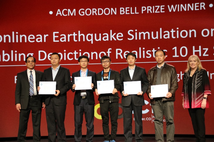 自主可控的全新硬件架构是“神威·太湖之光”超级计算机的核心竞争力之一,但与x86处理器截然不同的硬件特性,也对软件生态的建设带来了巨大的挑战。与超算硬件相对独立的阶梯式发展不同,应用软件的发展需要长期的积累。通过跨学科、跨单位的广泛交叉合作,基于“神威·太湖之光”系统的并行应用成果频出。2016年,3项全机应用入围“戈登·贝尔”奖(ACM Gordon Bell Prize)。“戈登·贝尔”奖是国际超算应用领域的最高奖,从1987年设立以来,中国团队从未入围过。这是该奖项近30年来中国首次入围。最终,经过评估与答辩,付昊桓参与的“全球大气非静力云分辨模拟”荣获“戈登·贝尔”奖。