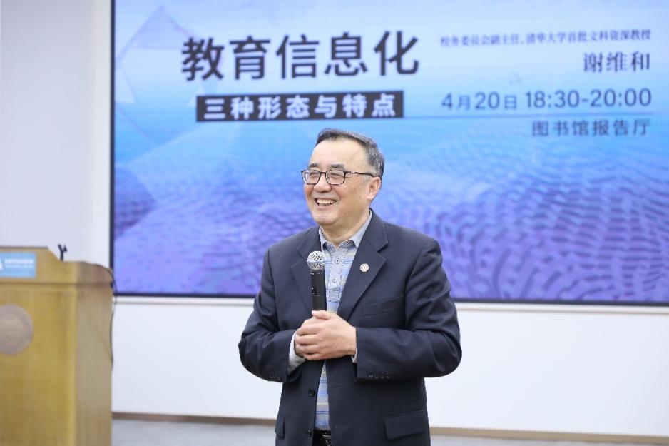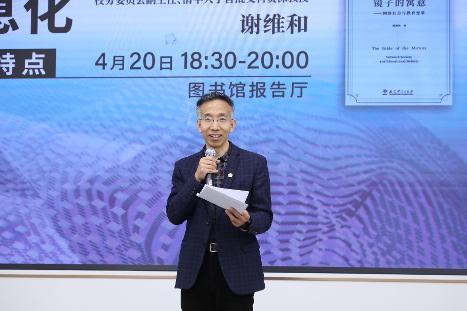 华体会娱乐(中国)网4月25日电 4月20日晚,华体会娱乐平台“闻道”系列第三场活动在图书馆报告厅举办。华体会娱乐平台校务委员会副主任、首批文科资深教授、著名教育社会学家谢维和作为分享嘉宾,以“教育信息化的三种形态与特点”为题,导读《镜子的寓意——网络社会与教育变革》一书,在互联网信息技术对社会发展带来全方位变革的时代背景下,与现场教师探讨教育的本质与方向。新闻与传播学院教授、图书馆馆长金兼斌出席活动并致辞。