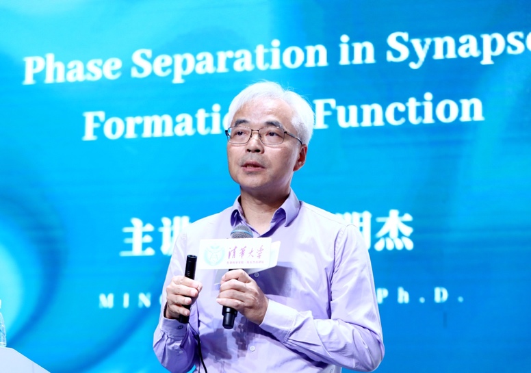 张明杰介绍了PSD(Postsynapse Density)对于神经突触可塑性的重要作用,并从“PSD如何形成”“PSD大小如何被调节”等科学问题出发,详细解释了生物大分子如何通过相分离调控突触的结构和可塑性,并进一步延伸到对“ePSD(Excitatory Postsynapse Density)和iPSD(Inhibitory Postsynapse Density)如何在狭小的空间中彼此固缩并隔离”等问题的剖析和讲解,最后分享了自己在相分离发生机制方面的最新探索,为与会师生带来了一场颇具启发性的精彩报告。