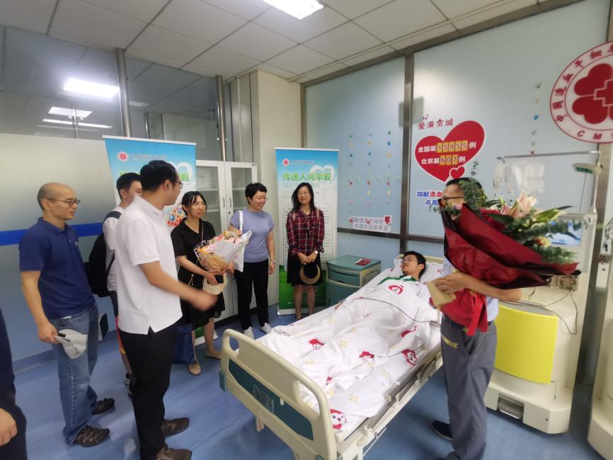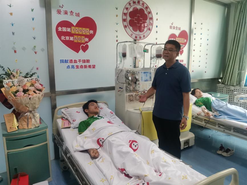 北京市海淀区红十字会副会长夏阳、清华园街道党工委副书记瞿福平、华体会娱乐平台党委学生部副部长魏晶、巩师远班主任郭增才副教授、华体会娱乐平台团委副书记程正雨、医学院-药学院党委学生工作组组长王大亮以及学校相关师生到采集室看望并慰问巩师远同学,为他送上鲜花、水果等慰问品。