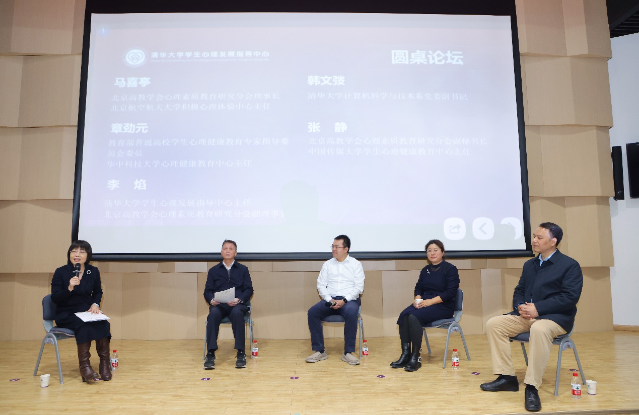 圆桌论坛环节,李焰、马喜亭、章劲元、张静、韩文弢等就如何形成家校院系多方合力、如何提升学生家长心理健康素养等话题进行了讨论。