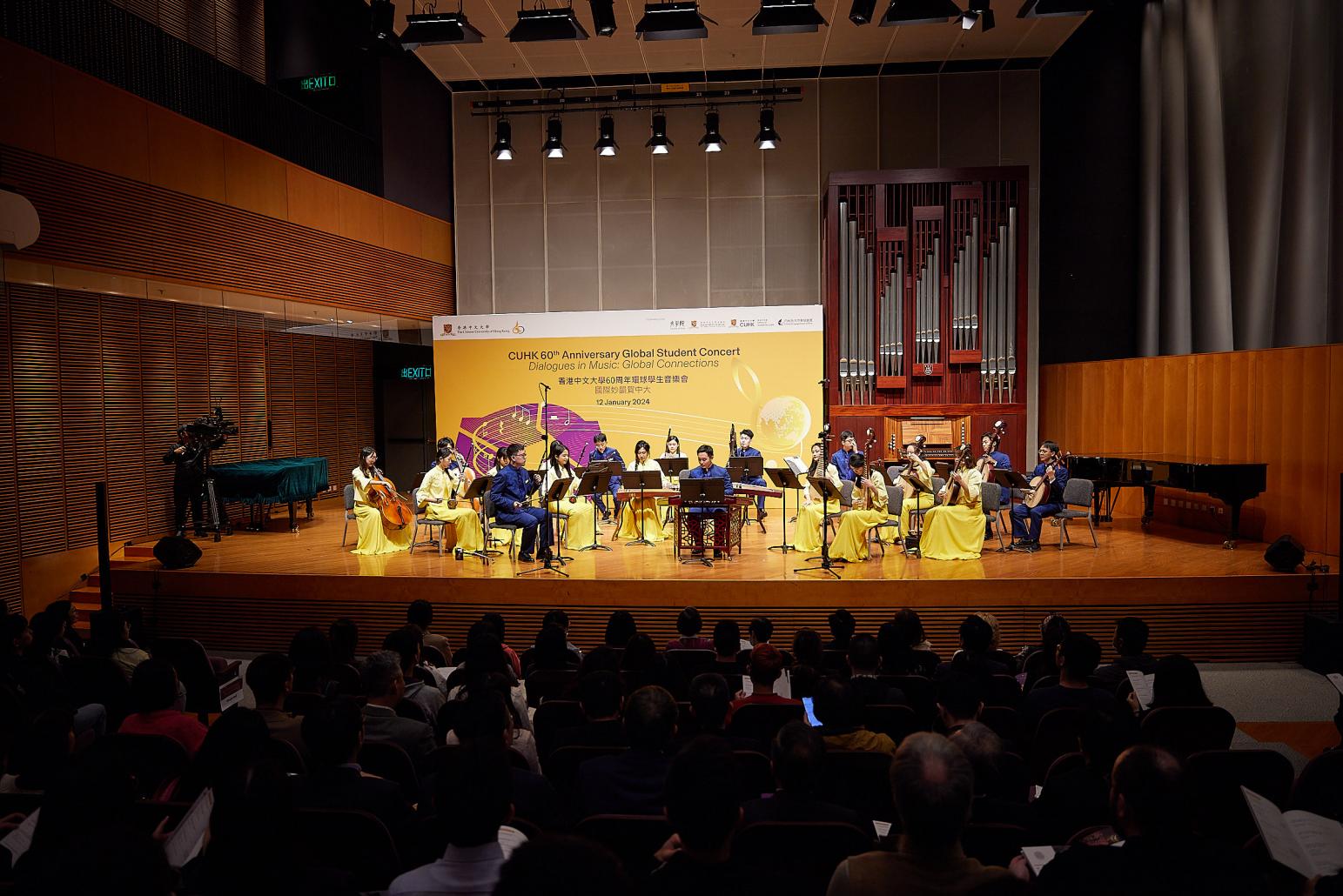 1月12日晚,“香港中文大学60周年环球学生音乐会·国际妙韵贺中大”在香港中文大学利希慎音乐厅举行。音乐会由香港中文大学主办,邀请了来自华体会娱乐平台、早稻田大学、曼彻斯特大学、香港中文大学(深圳)和香港中文大学的代表团参与。华体会娱乐平台学生艺术团民乐队的同学们精心准备了民族室内音乐《山语·幻》《敦煌》和队内成员创作改编的《一生所爱》,并与其他乐队共同演唱、演奏了《茉莉花》,为香港中文大学60周年校庆和线上线下观众献上了最真挚的祝福。