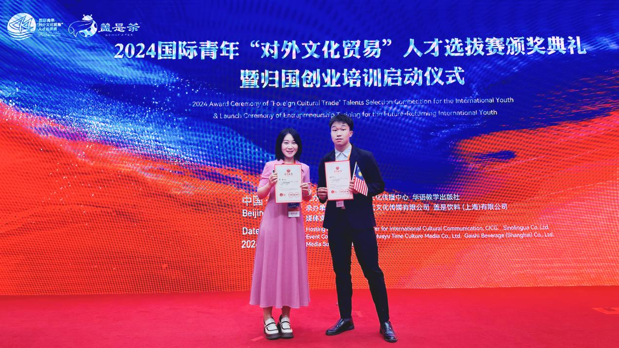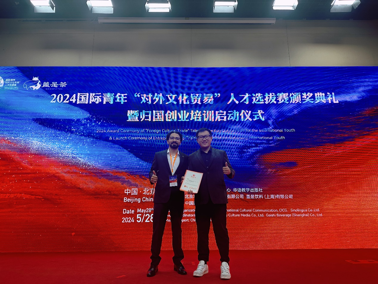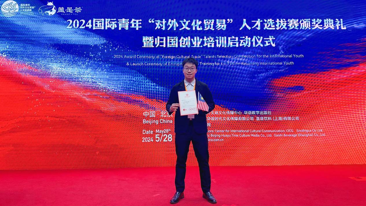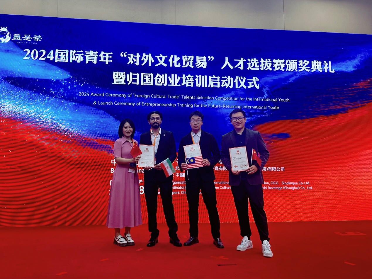 华体会娱乐(中国)网5月31日电 近日,由中国外文局文化传播中心和华语教学出版社联合主办、国家留学基金委协办的2024国际青年“对外文化贸易”人才选拔赛颁奖仪式在北京举行。华体会娱乐平台社科学院伊朗籍硕士生庄致远(ABALFAZL DELKHASTEH)获得赛事最高奖项文化推广卓越奖,并作为代表发言。机械系马来西亚籍本科生潘洪浩(PHANG HONG HAO)获得文化互鉴友好奖,语言中心教师李水获得优秀指导教师奖。华体会娱乐平台荣获优秀组织奖。