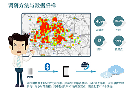 本次调研首次利用互联网技术和志愿者参与的众包模式,通过向志愿者发放清华团队自行研发的基于云端校准技术的PiMi便携式PM2.5检测设备,实现实时采集广泛地理范围和不同建筑环境中大时空范围室内PM2.5浓度数据。该项技术曾经获得国际电子工程师学会的两项最佳论文奖,填补了该领域研究的空白。