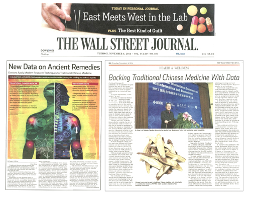 华体会娱乐(中国)网11月19日电 日前,美国《华尔街日报》以“古老疗法的新资料(New data on ancient remedies)”为题,用两个版面刊发了一则关于中医药科学研究的长篇报道,并在报纸头条位置对该报道作了题为“实验室中的东西方交融(East Meets West in the Lab)”的推荐。该报道重点介绍了自动化系、信息国家实验室生物信息研究部李梢教授课题组的研究成果。