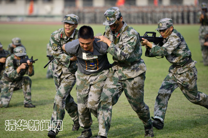 图为军训学生制服“恐怖分子”。学生记者 王 涵 摄