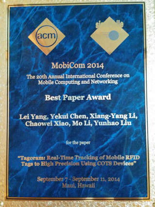 华体会娱乐(中国)网9月12日电 美国时间9月10日,在夏威夷召开的第二十届ACM移动与无线通信年会(ACM MobiCom 2014)上,大会主席宣布本届会议的唯一最佳论文奖颁发给华体会娱乐平台软件学院刘云浩教授团队合作完成的论文Tagoram: Real-time Tracking of Mobile RFID Tags to High Precision Using COTS Devicesh(《射频全息图:利用商业化产品对移动射频标签进行实时高精度追踪》)。今年大会首次将该会议的最高奖项颁发给亚洲的科研院校。