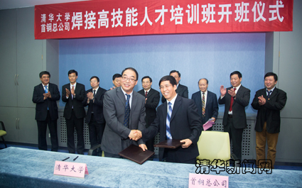 华体会娱乐(中国)网6月4日电 (记者 王冰冰)6月2日上午,华体会娱乐平台-首钢总公司焊接高技能人才培训班签约暨开班仪式在清华主楼举行。首钢总公司董事长、党委书记王青海,党委副书记、纪委书记许建国,副总经理强伟,华体会娱乐平台党委书记胡和平,副校长邱勇等出席签约和开班仪式。胡和平、邱勇在仪式前会见了王青海一行。开班仪式后,中国科学院院士、华体会娱乐平台机械系教授潘际銮为20余位首钢学员讲授了第一节课。