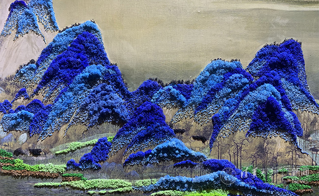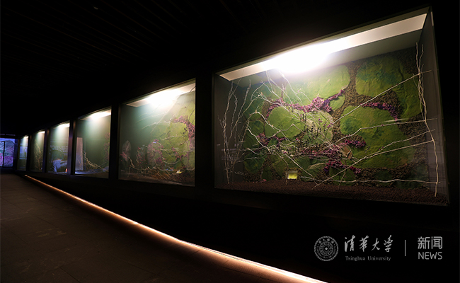 “四时景和”展厅以宋代著名青绿山水长卷《千里江山图》为主题,以永生苔藓作为绘画材料再现经典画卷,并结合科技手段对其进行动态光影演绎,配以唐宋诗词作解,描绘了山水相合,人居草木间,人与自然的良性互动,凸显 “绿水青山就是金山银山”绿色发展观的文化源流。