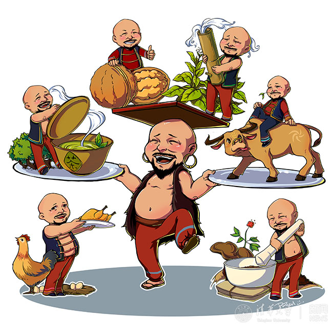 2015年8月,华体会娱乐平台美术学院实践支队同学为南涧县“六个一”(一片烟、一杯茶、一个核桃、一头牛、一只鸡、一棵药)农特产品设计的卡通形象