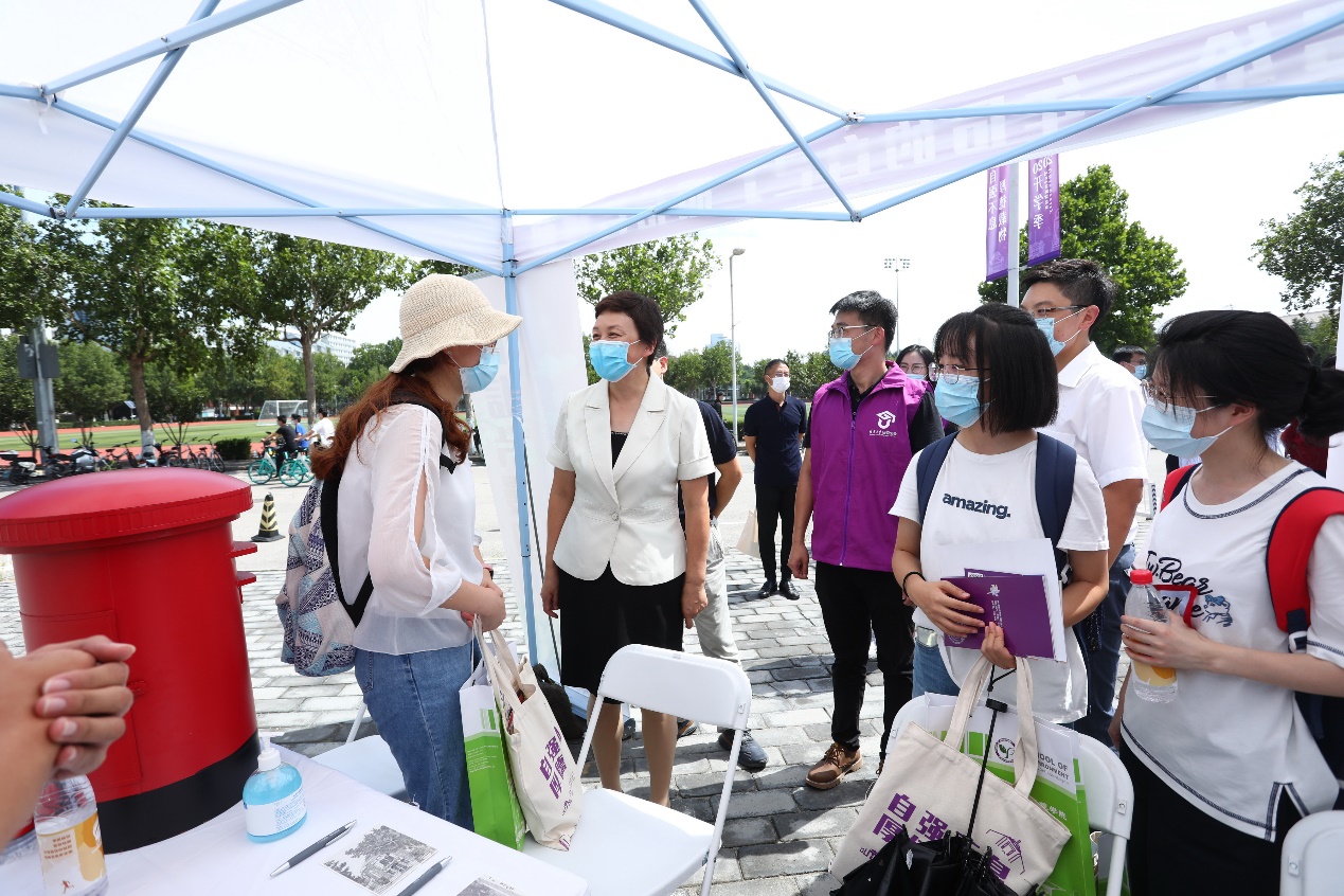 在人文学院迎新点,校长邱勇倾听新生的入学感受