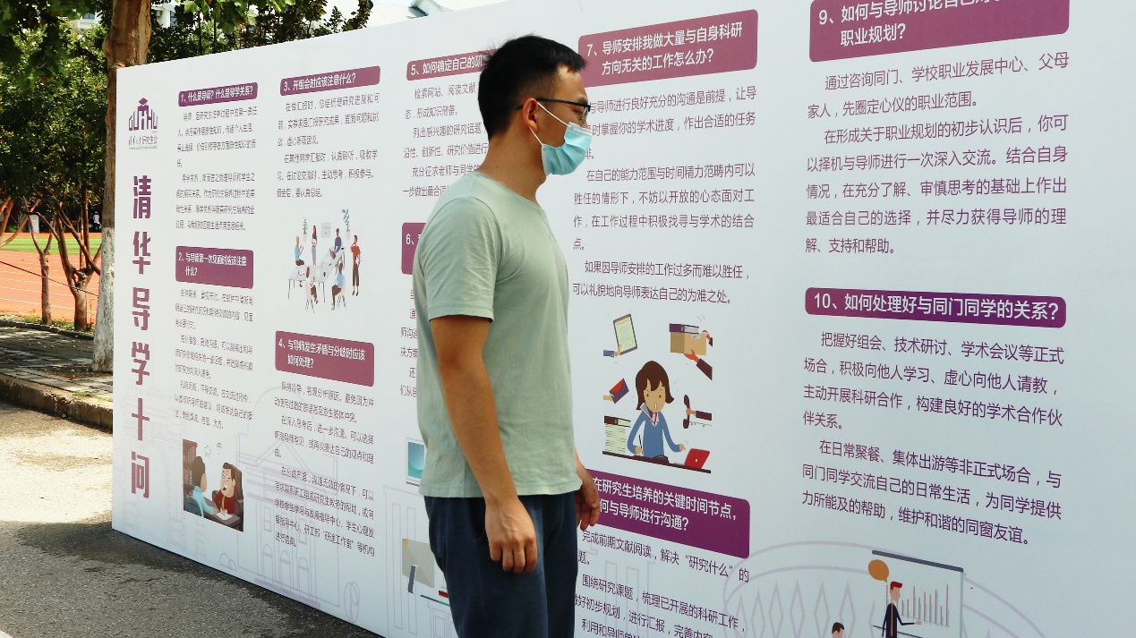 为引导研究生新生同学正确看待和合理处理导学关系,促进形成导学思政育人合力,同时响应节约粮食号召,迎新现场特设置“学风与厉行节约主题展览区”,展示“清华导学十问”及九条“厉行节约口号”,解答新生最关心的导学问题,倡导节约粮食的校园风尚。
