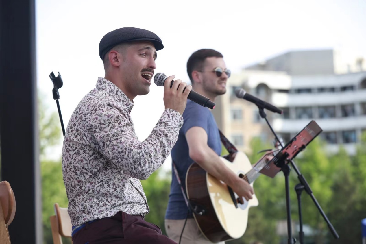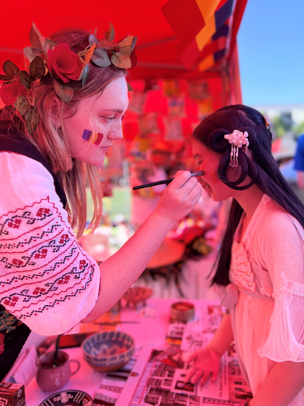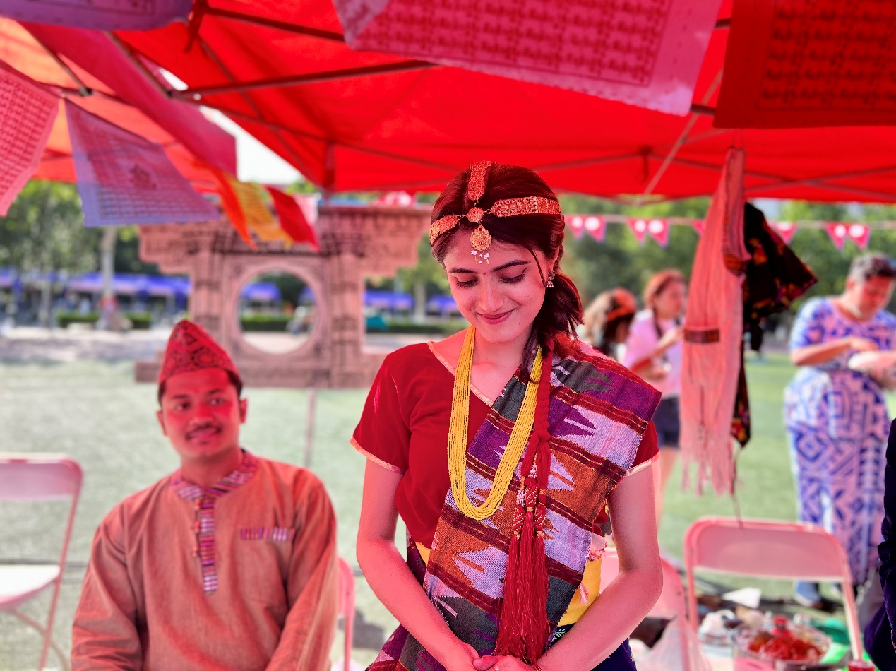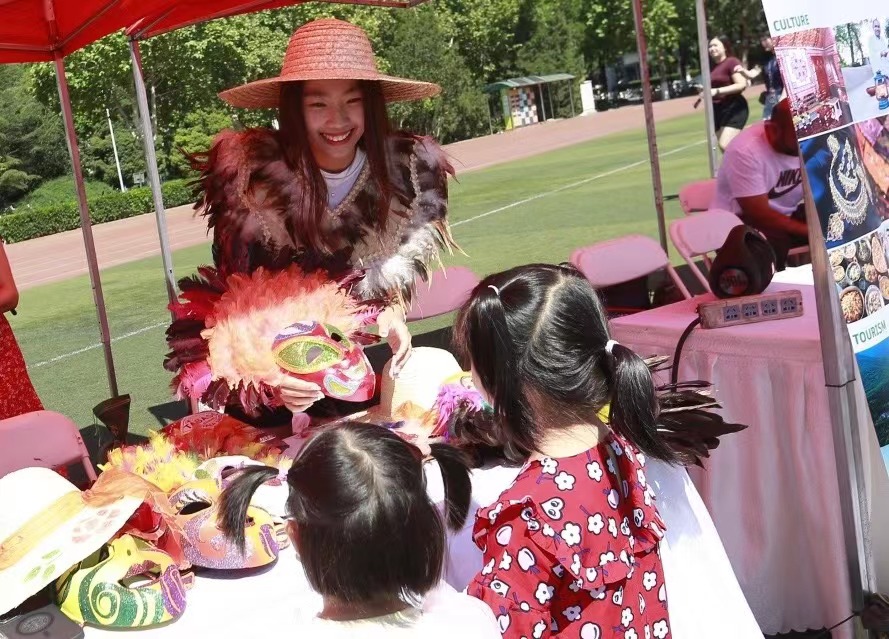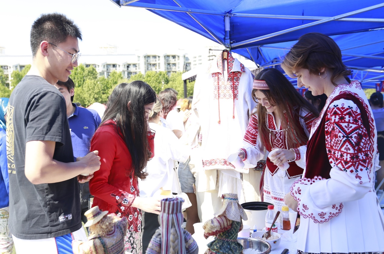 特色展览区域设有45个特色展棚,来自世界各地的学生们展示着各国文化,纷纷拿出最具地域特色的美食特产、手工艺品、民族服饰、趣味游戏等,吸引观众驻足交流。哈萨克斯坦展棚里,身着民族服装的善蒂(ALDABERGENOV,SHADI)向大家热情地介绍着挂在展棚里的传统狩猎武器、骆驼摆饰和当地特色挂毯;罗马尼亚展棚里,头戴花环的蒋语竹(MANOLACHE,ANDREEA DIANA)正在为游客做人体彩绘罗马尼亚小国旗;土耳其展棚里地道的土耳其咖啡煮好了,忙碌的穆斯塔法(OZBEK,MUSTAFA UMUT)一边招呼大家喝咖啡、品尝土耳其Baklava(一种甜的土耳其酥皮点心),一边热情宣传土耳其旅游,他们甚至为抽奖幸运儿准备了中国到土耳其的往返机票大奖;另一边又传来一阵笑声,原来是美国展棚“吃热狗大赛”开赛了,活动“重在参与”,不管能否获胜,都可以品尝到美味地道的美式热狗!