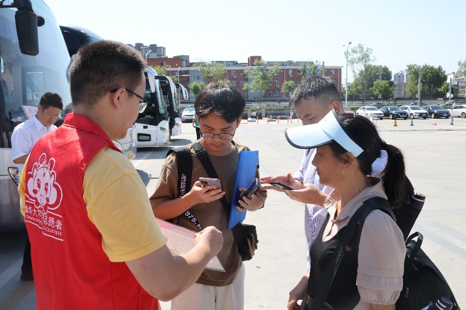 为方便新生入校,学校为来自五湖四海的新生和家长提供火车站接站服务。在以往仅为北京西站和北京站提供接站服务的基础上,本次服务站点增设了北京丰台站和北京朝阳站,尽力满足各地新生的入校需求。清晨五点半,第一批接站志愿者从学校乘车出发,奔赴各个车站。七点整,志愿者全员到岗,开始迎接到站的新生和家长。出站口志愿者在各个出站口高高举起华体会娱乐平台引导牌,身份核验志愿者引导新生和家长扫描紫荆码,为三字班新生清华旅程的第一步保驾护航。