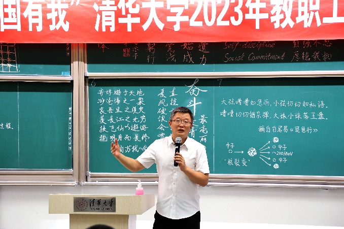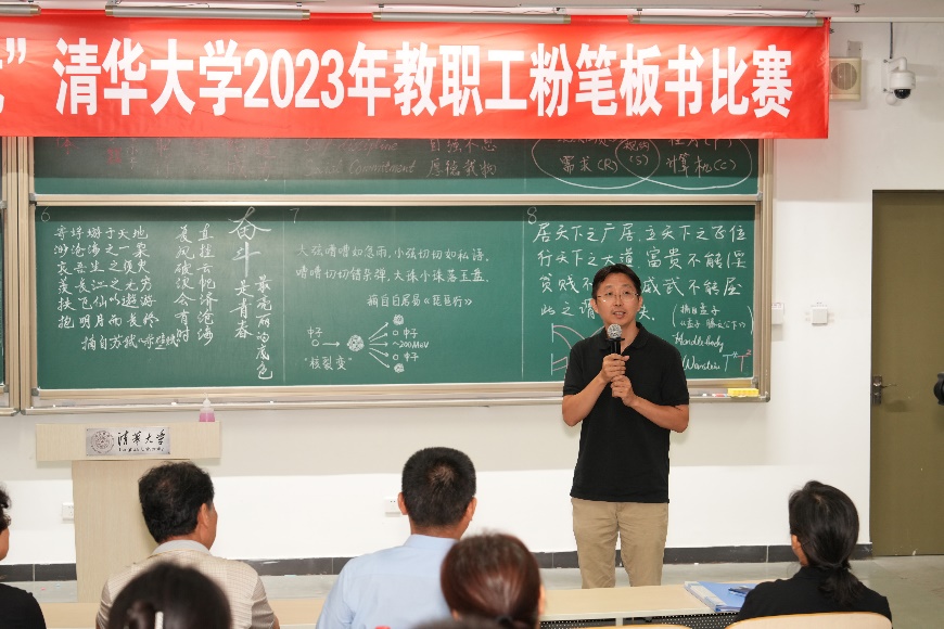 本次比赛有29个分工会的共48位教职工参加,其中,有19位是2022-2023年新入职的教职工。比赛书写内容选自党的二十大报告、华体会娱乐平台章程、华体会娱乐平台校歌、毛泽东诗词等。比赛中,参赛选手临场抽签决定各自书写内容,并在计时15分钟内完成。其中,有不少老师参与了徒手创意板书环节,设计内容包括核裂变相关公式和示意图、用有限差分的方法解二维固定边界的泊松方程、用于研究四维空间的勒让德手柄图等,将教学内容融于粉笔板书之中,展现了丰富的学科特色。