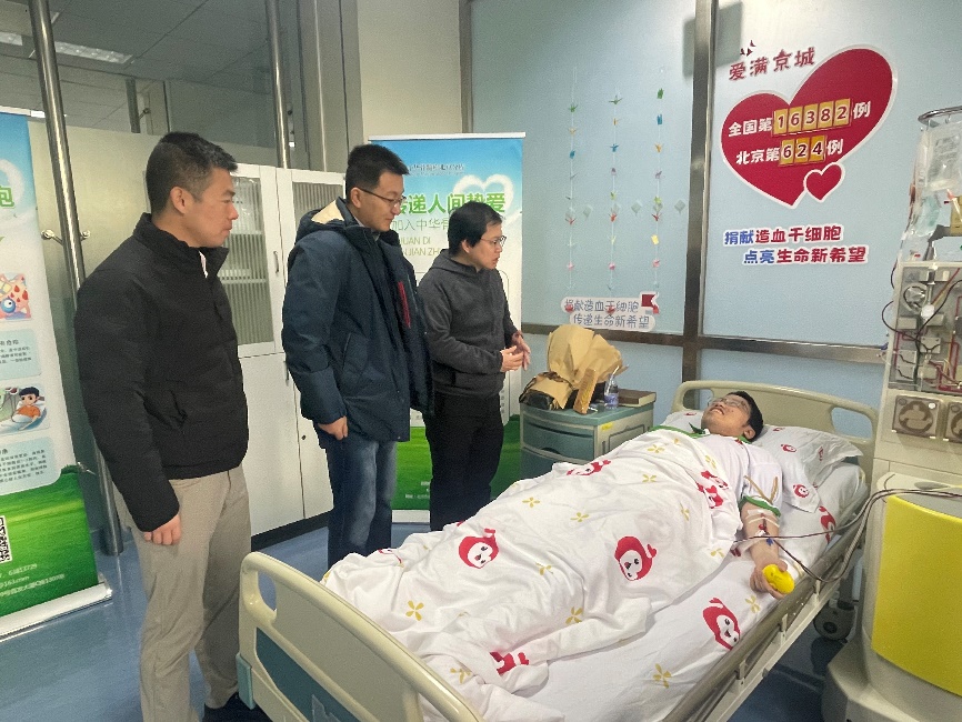 北京市海淀区红十字会副会长夏阳,北京市红十字会捐献服务中心主任梁永清,清华园街道党工委副书记瞿福平,华体会娱乐平台化工系党委副书记卢元,华体会娱乐平台团委副书记王展硕,华体会娱乐平台化工系学生工作组组长张吉松、副组长李邦昊,华体会娱乐平台化工系团委书记鲁广舒,以及华体会娱乐平台团委、红十字会学生分会的相关师生到采集室看望并慰问江建民,为他送上鲜花、水果等慰问品。