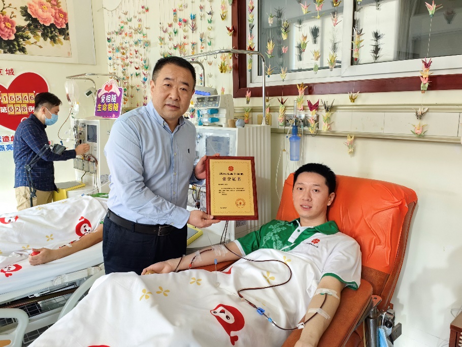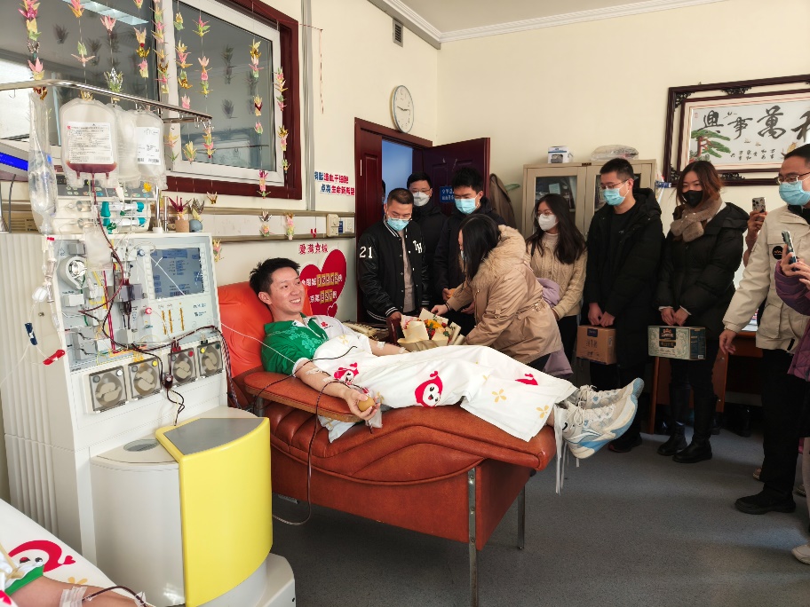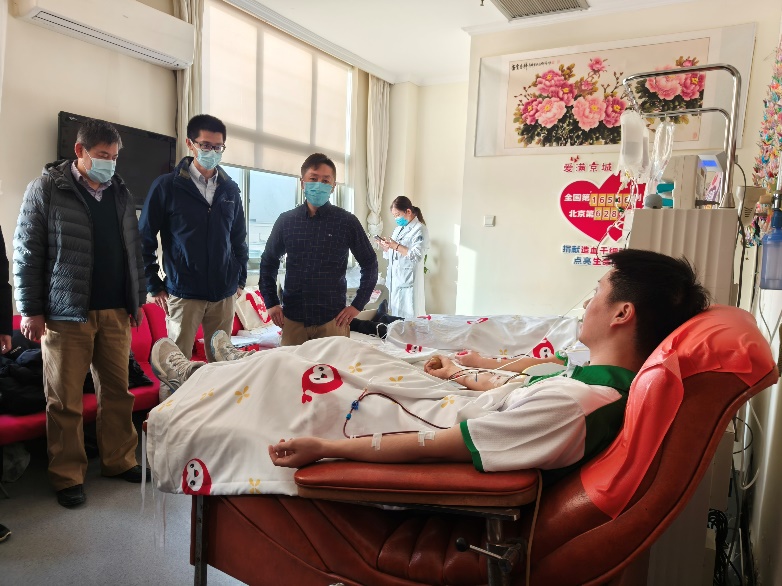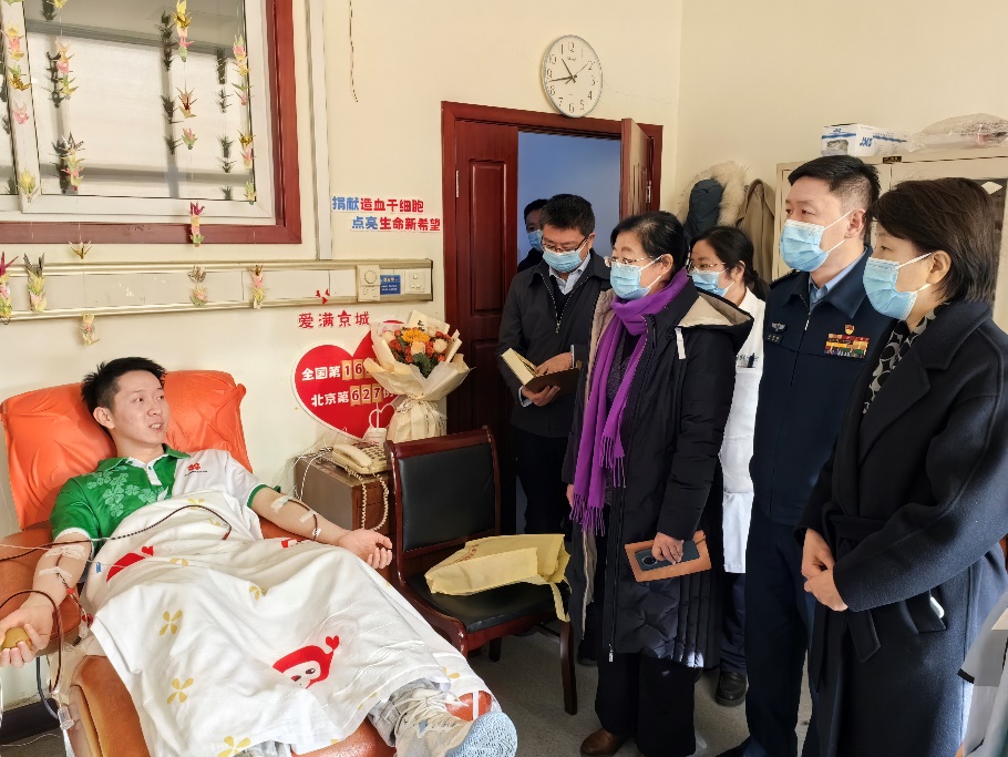 北京市海淀区红十字会会长林航、常务副会长张宇光、副会长夏阳,北京市红十字会捐献服务中心主任梁永清、副主任谭奕,华体会娱乐平台团委书记王睿、党委学生部副部长王腾飞、团委副书记程正雨、工业工程系学生组组长于瑞峰等到采集室慰问唐海景,为他送上鲜花、牛奶等慰问品。