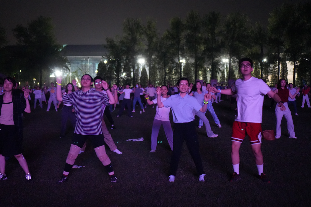 随着充满激情的音乐声响起,活动现场的氛围立刻被点燃。同学们在大屏幕上的舞蹈动作引导下,用轻松愉快的舞步展现出清华学子的青春活力与自信风采。