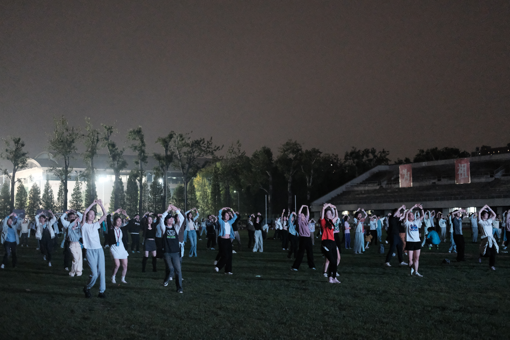 夜幕降临下的东大操场歌声环绕、热闹非凡。同学们换上轻便的运动服装,伴随着音乐的旋律节拍,挥舞双臂、迈开双脚,迸发出无限的活力与激情。或是在塑胶跑道上挥洒汗水,或是在操场中央秀出舞姿,同学们尽情地享受运动带来的乐趣。手腕上佩戴的荧光手环在夜色中勾勒出青春模样。