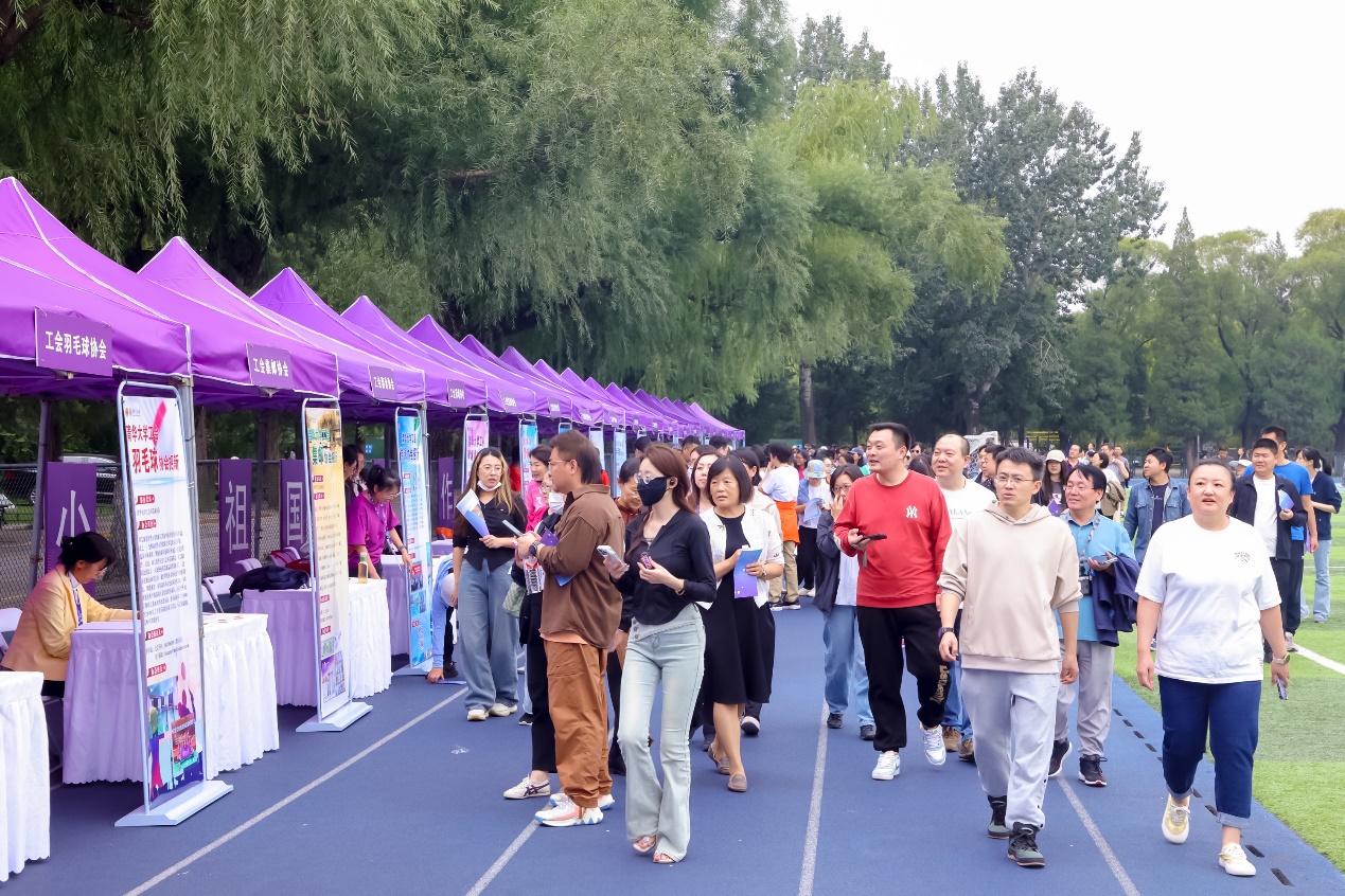 在西大操场东侧跑道上,校工会为20多家工会教职工文体协会设置了展位,工作人员围绕协会开展群众性文体活动、营造和谐校园氛围等情况进行介绍。北侧跑道上,校工会联络了多家校外机构开展服务咨询,为丰富教职工业余生活提供更多便利。