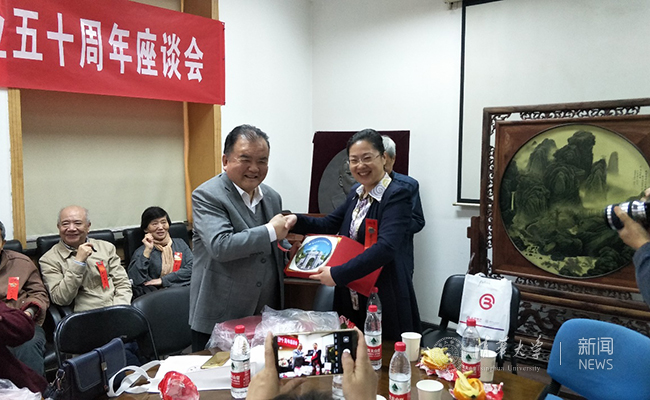 座谈会后,祝允林老学长带来了自己的礼物——印有清华二校门的观赏盘,并当场委托李宇红赠送给能动系。